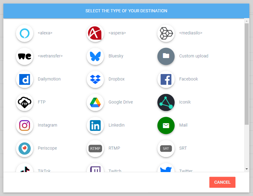 Destinations are the platforms you want to publish to (e.g., YouTube, Twitter, Facebook, TikTok, custom S3 buckets, or FTP).