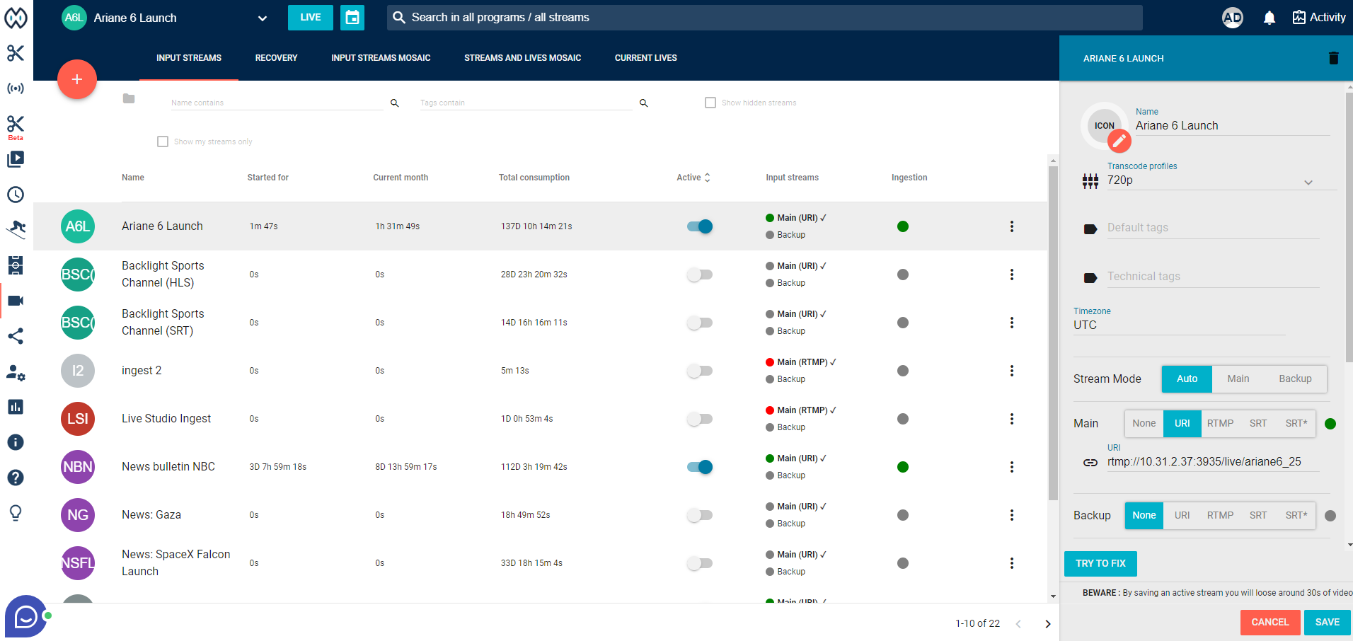 Ingest live streams or files