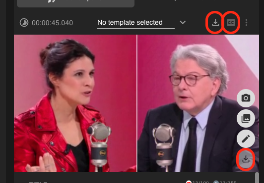 In the Clip Details pane (right side of the video player, above the thumbnail preview), locate the download buttons for clips, subtitles and thumbnails.
