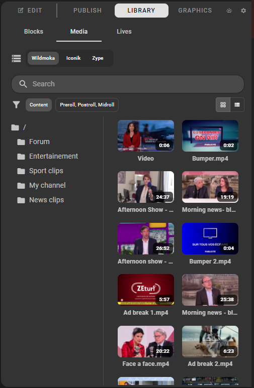 Media VOD assets, including clips imported or created in Wildmoka. The media library can integrate external repositories such as Iconik and Zype.