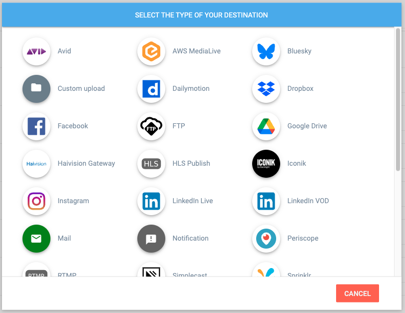 This opens a visual interface to select from a wide library of supported destination types.