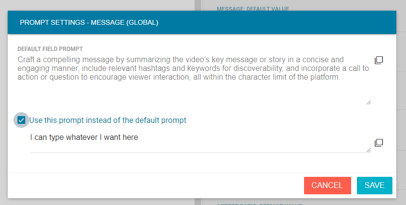 Defining field-level prompts at the destination level when inputs do not depend on users or templates (e.g. content age-appropriateness).