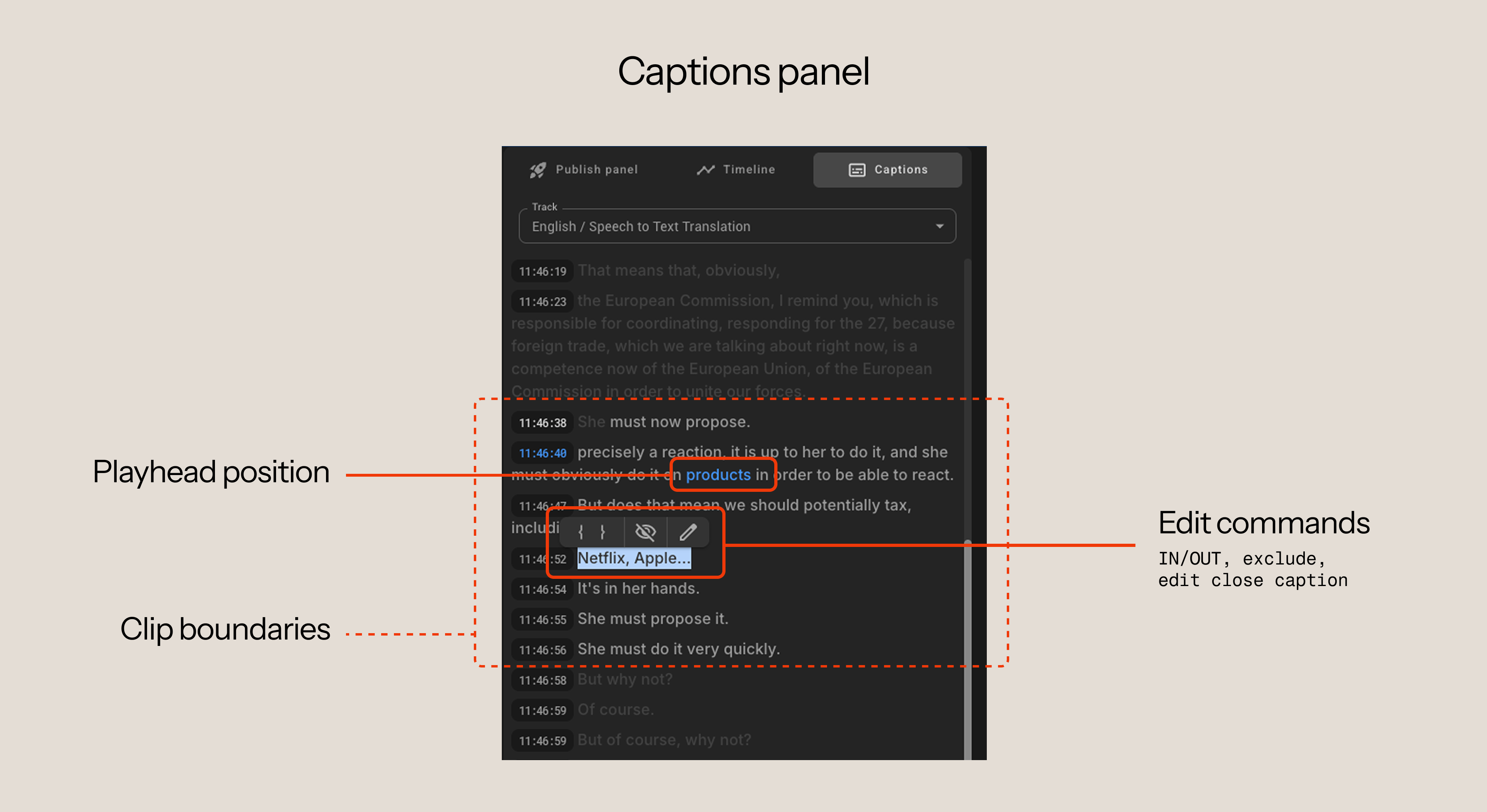 How it works: Requires AI Text-to-Speech or Translation. Click any word in the Captions panel to jump the playhead to that moment. Select a range of text to automatically set your clip boundaries based on the transcript. Use the eye icon to exclude sentences (like filler words) from captions, or use the pencil icon to edit the transcript text directly. This works identically on both the original transcripts and the translations, maintaining the same frame-accurate precision across languages.