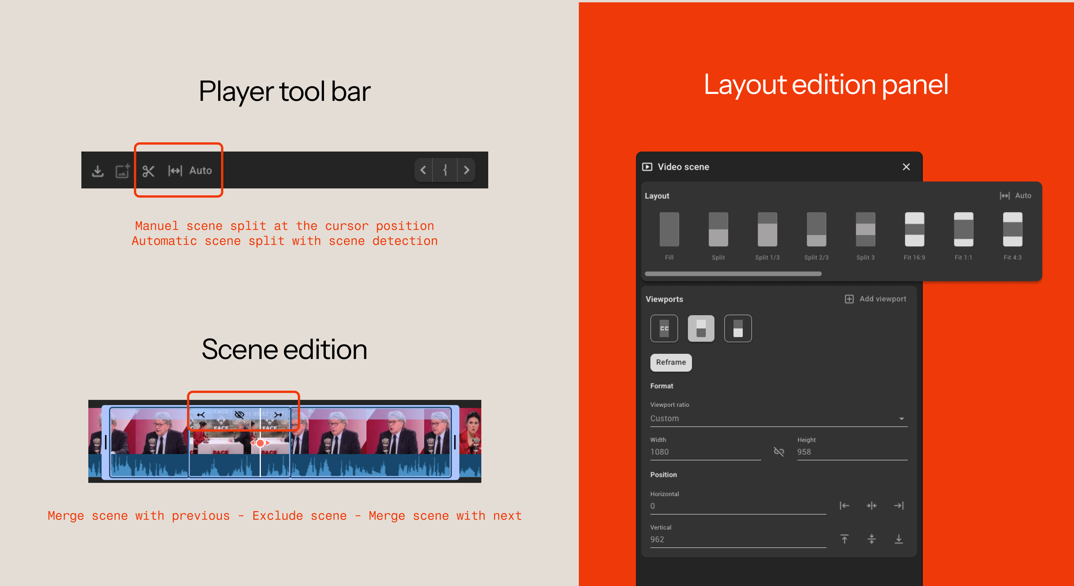 How it works: Use the 'Scissor' button or 'S' shortcut to split your clip into scenes. Select any scene to apply layout templates like 'Top/Bottom Split' or 'Fit.' Each scene can have its own layout, and you can manually resize and position viewports within each scene; useful when you need to show two speakers who appear in different areas of the source frame.
