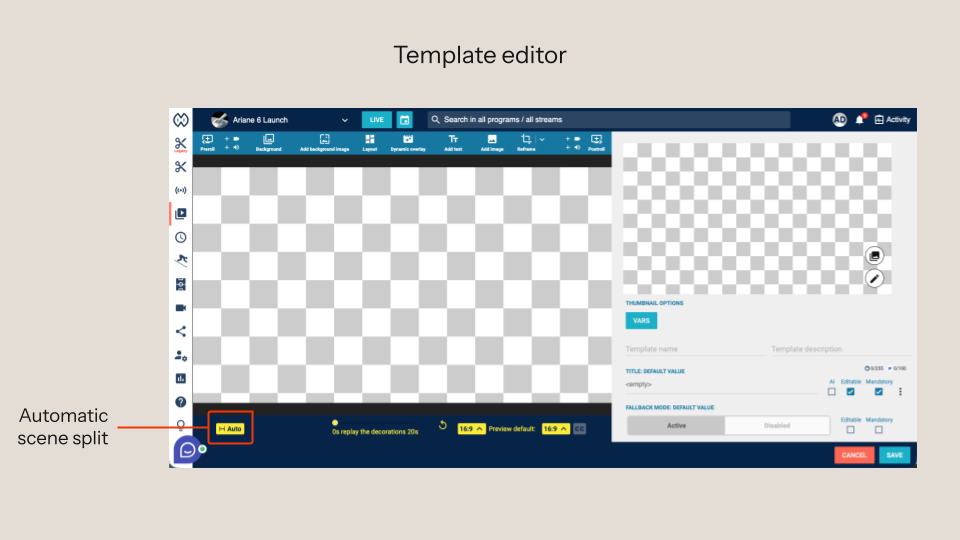 How it works: The template editor now contains a new button ‘Auto’ (bottom left corner of the screen) to activate the automatic scene splitting when the template is applied to the clip. Viewing the actual split of scenes in the player ribbon may take a few seconds after the application of the template.
