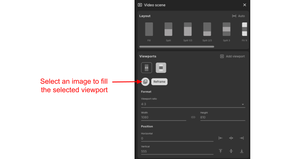How it works: A new button in the scene editing panel lets you select (or deselect) an image to replace the video in the viewport. The image appears centered in the viewport. In this release, you cannot reframe the image.
